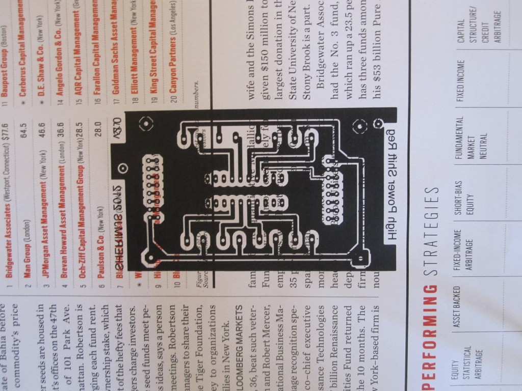The magazine paper is ironed onto prepped copper clad board and then the paper is dissolved with warm water leaving the toner fused to the copper clad. (not the same circuit as the previous photo)